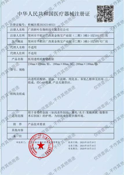 廣西妍葉化妝品有限公司成功通過醫(yī)用械字號“醫(yī)用透明質酸鈉敷貼”二類證件批文審核!這是全體員工不懈努力、嚴格遵循國家標準和審批流程的成果。